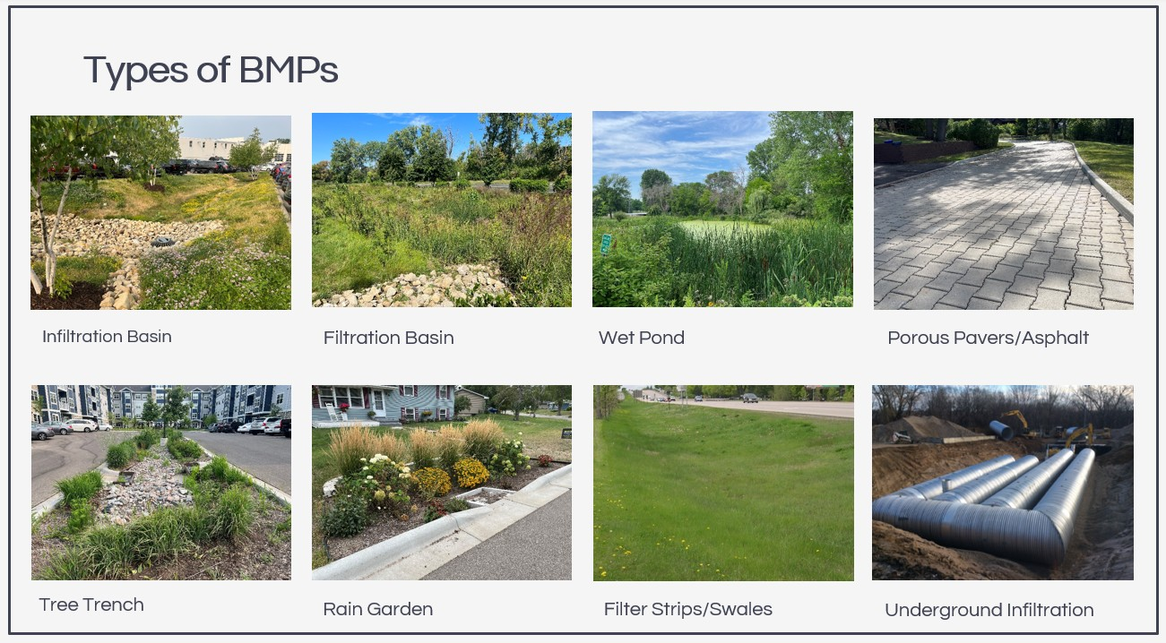 Stormwater facilities (also referred to as BMPs) are above or belowground permanent systems designed to manage the quantity and quality of stormwater runoff. These facilities incorporate both man-made infrastructure, such as piping and outfalls, and natural enhancements, like soil media and native vegetation, to reduce runoff volume and pollution. Examples of these facilities include but are not limited to: wet and dry ponds, filtration and infiltration basins, filter strips and swales, rain gardens, tree trenches, permeable pavement, underground filtration and infiltration systems, and underground detention systems.