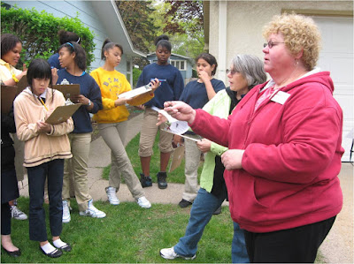 | Linda instructs Battle Creek Middle School science students in sod removal at their residential rain garden project. |