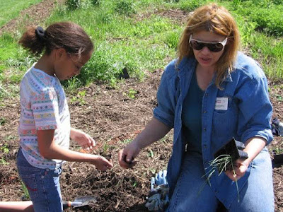 | Nancy Nygaard helps students transplant seedlings. |