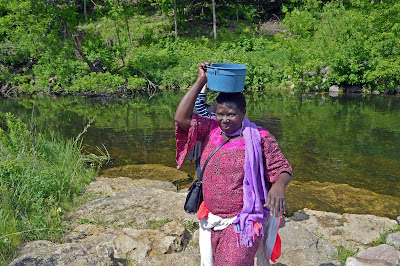 | A Harmony ESL student carries water up from Keller Creek to test it for dissolved oxygen, pH and temperature. |