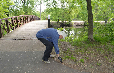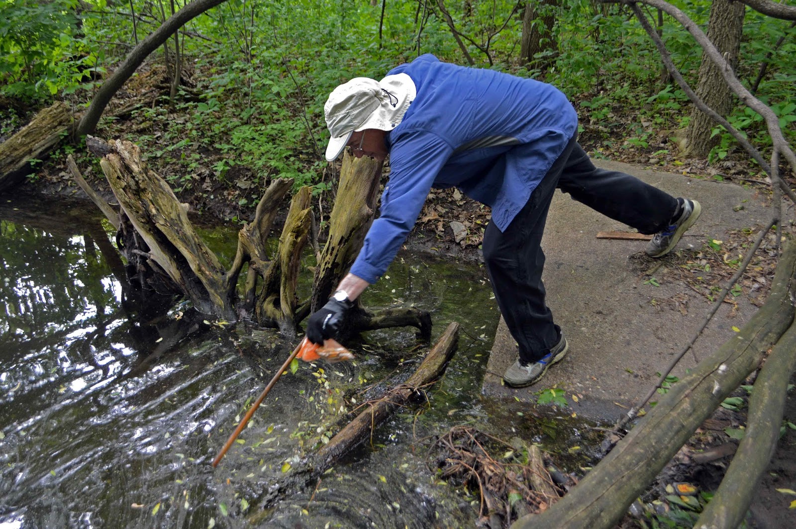 One late May morning this spring, while I was out at Keller Creek near Round Lake helping classes during our restoration efforts, I spied Roger coming down the paved path. I decided to seize the moment and take some time to accompany him on his route to get a closer look at what has become Roger’s passion for almost a decade. As we proceeded on our walk, I asked him how he first got started on this mission.
