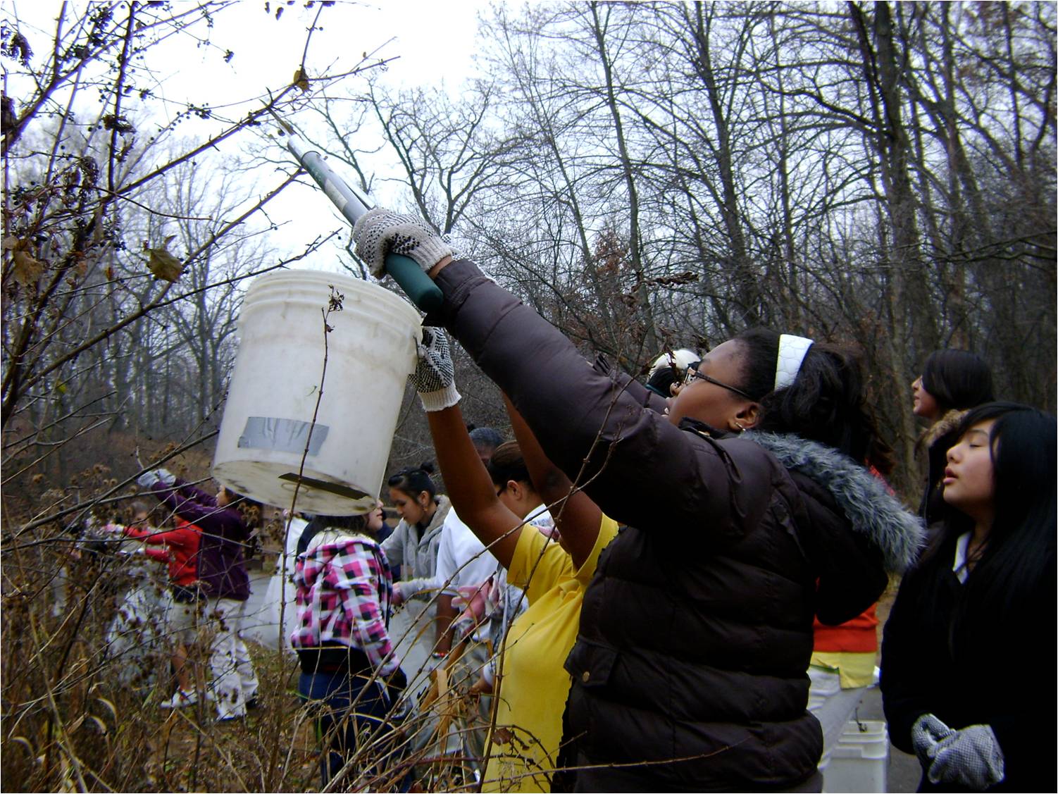 Here Battle Creek Middle School students trim buckthorn growing alongside the creek.