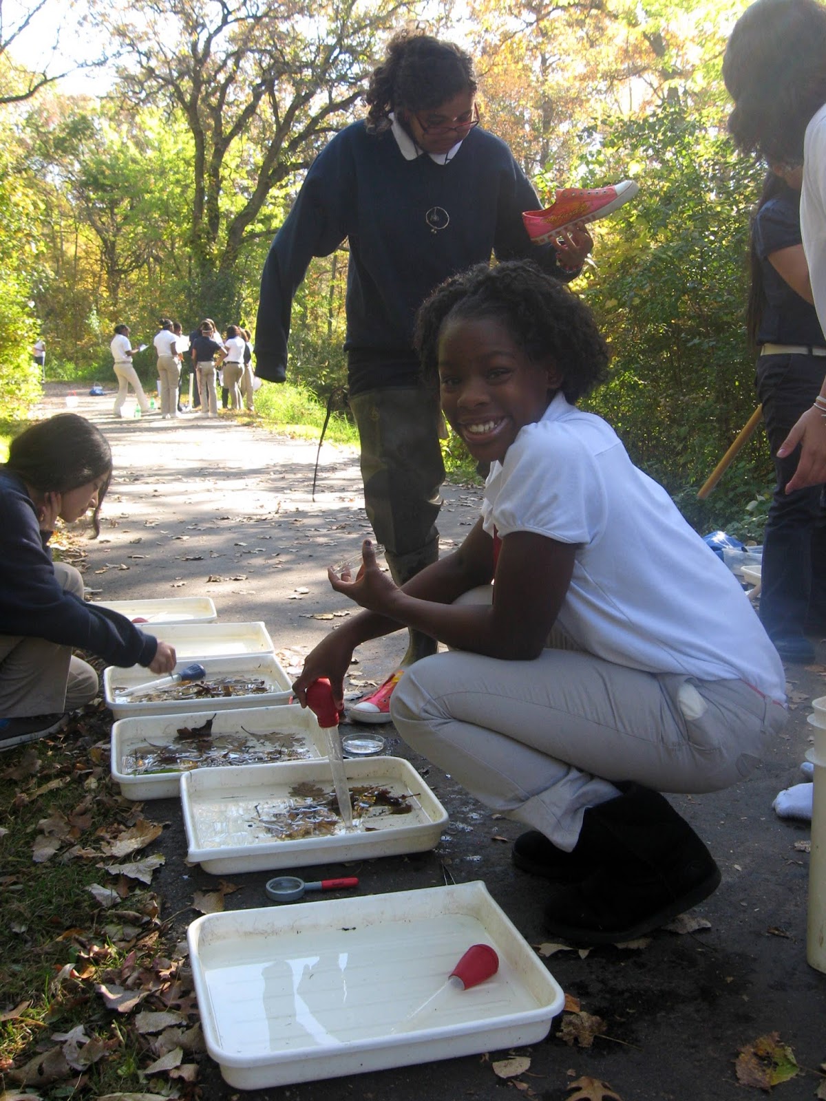 | Sue helps her science students identify macroinvertebrates. |
