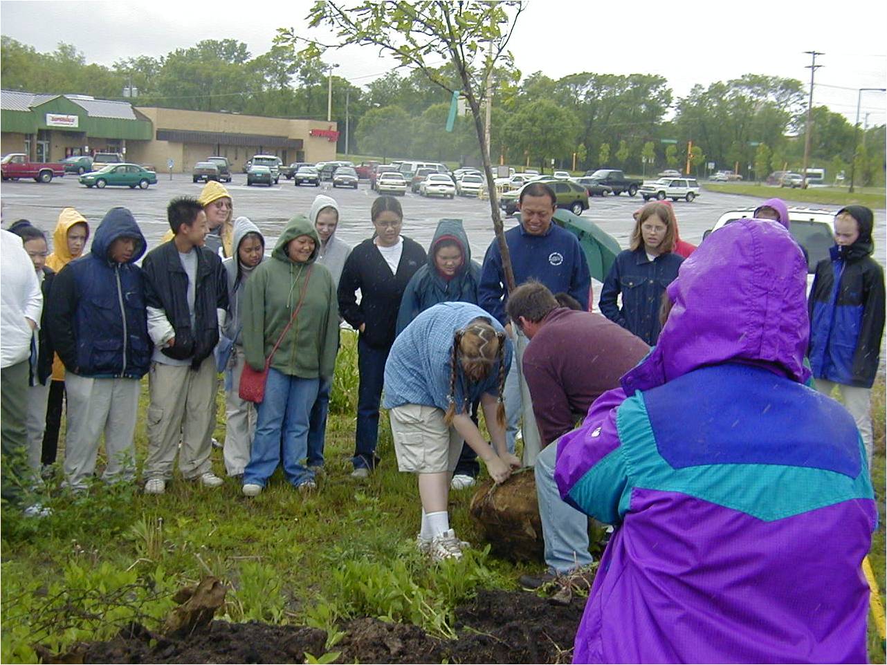 | Sue looks on as her students plant a tree on the edge of the site of Phalen Shopping Center before the center was torn down for the Ames Lake Restoration in 2000. |