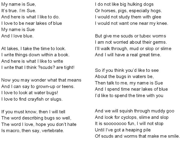 Sue could be academically challenging, but she also used her sense of humor to engage students in learning. Here’s a poem she wrote about herself in order to share some vocabulary words about the macroinvertebrates that live in Ames Lake.