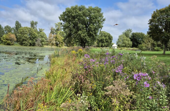 Adjacent to Keller Creek sits our Gateway Prairies, and next to Round Lake is Round Point. These areas were once seldom used, weedy turf that started being transformed into prairies by RWMWD and the County in 2022The prairies along Frost Avenue (so named the Gateway Prairies due to their proximity to the Gateway Trail) were once areas of very compacted soil, likely due to legacy dredge material that was placed there from work done on Keller Creek.  These areas were mowed turf and due to the compacted soils, acted like “green concrete”, sending stormwater runoff into Keller Creek.  Now, deep-rooted prairie plants infiltrate stormwater and provide habitat for bees, birds, butterflies, and more.  Funding for this turf-to-prairie conversion was provided by a Conservation Partners Legacy grant and District funds