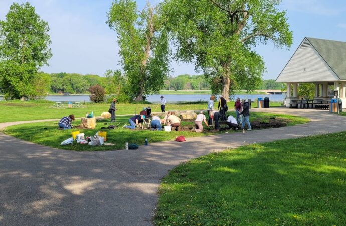 Once the soil was installed, we sowed a diverse native seed mix designed specifically for the site. After seeding, the area was covered with biodegradable erosion control fabric to stabilize the soil and help our plants germinate. Finally, with the help over 250 local students and other staff and partners, we installed over 2,600 plants into the shoreline. These plants have a wide range of bloom times for pollinators and deep roots that will stabilize the shoreline. Several trees and shrubs were also installed to add structure and diversity. Most of this work was funded by a Conservation Partners Legacy Grant, which is part of Minnesota’s Clean Water Land & Legacy Amendment.