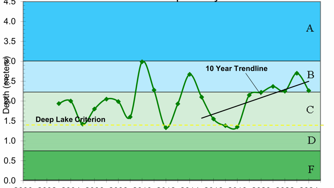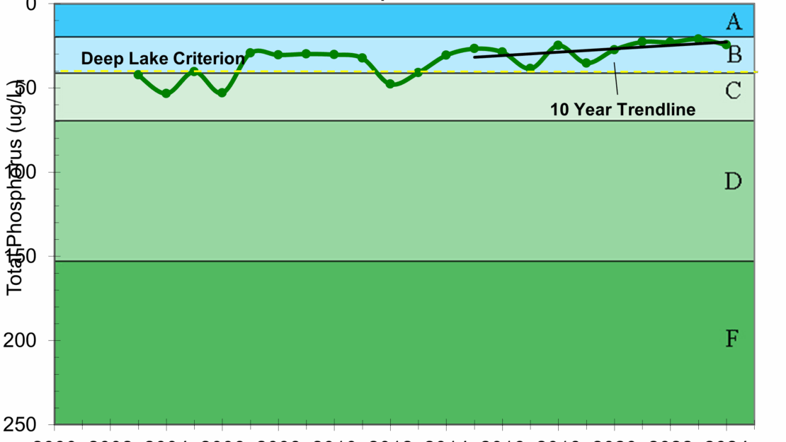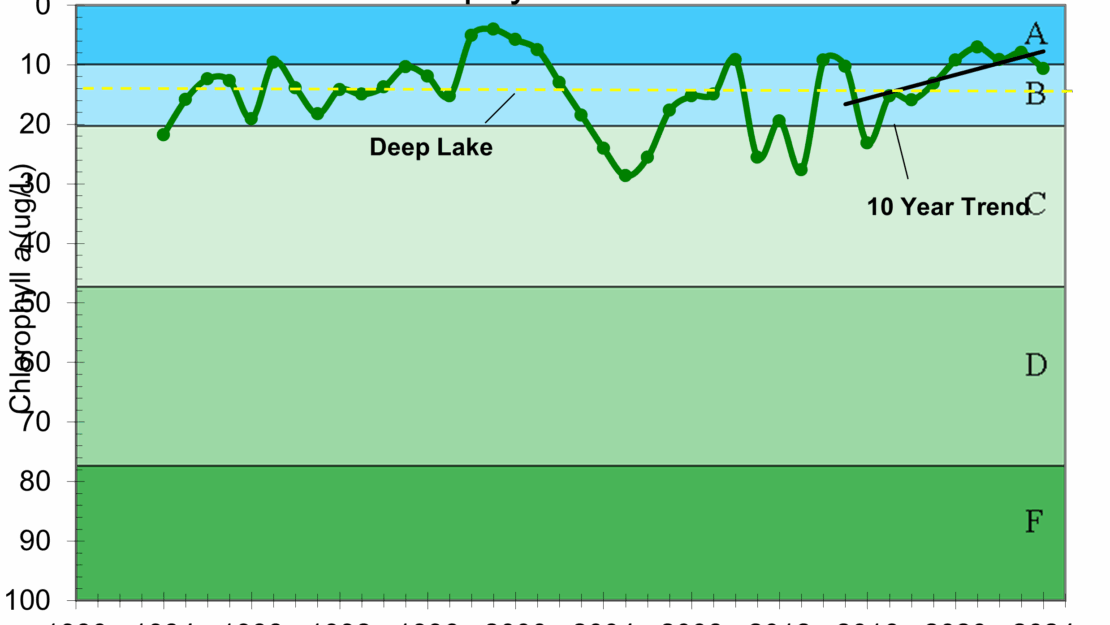 The following graphs show the growing season average measurements in Lake Owasso for chlorophyll-a, total phosphorus and secchi transparency. Lake Owasso is sampled for water quality parameters every two weeks from May through September.