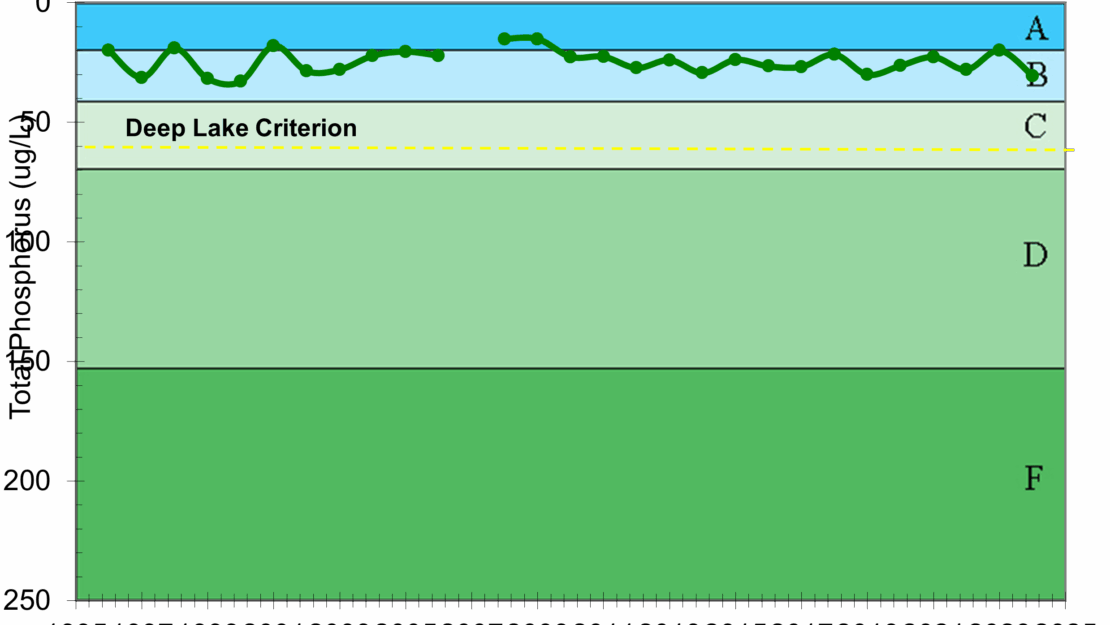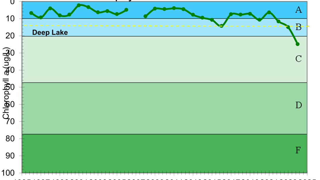 The following graphs show the growing season average measurements in Twin Lake for chlorophyll-a, total phosphorus and secchi transparency. Twin Lake is sampled for water quality parameters every two weeks from May through September.