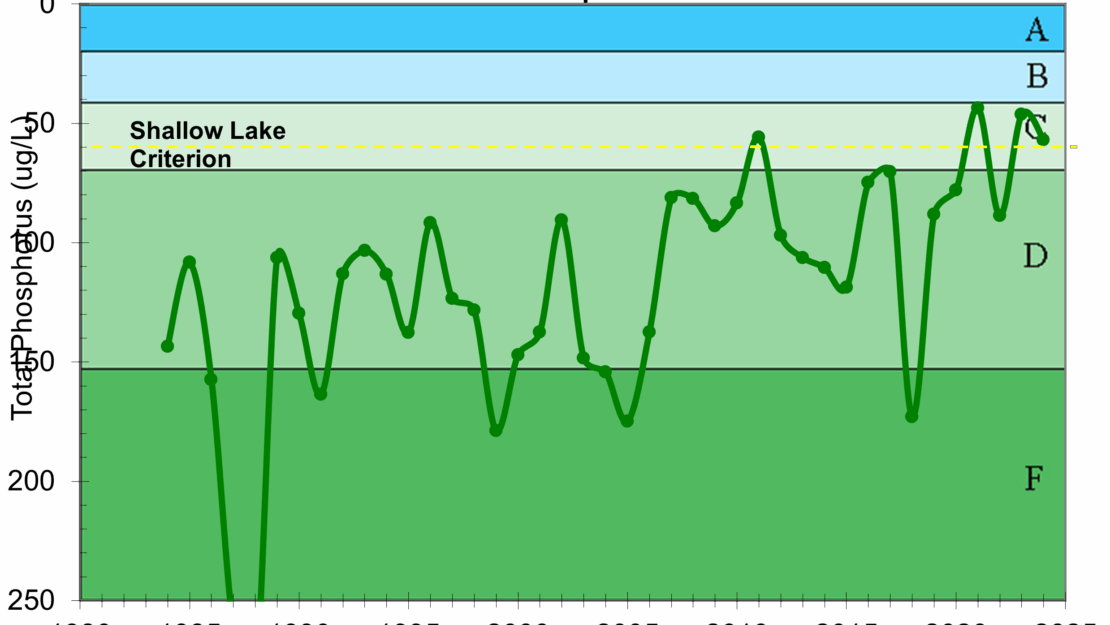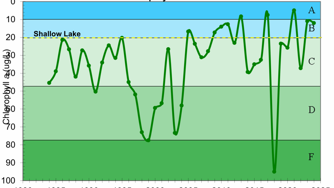 The following graphs show the growing season average measurements in Wakefield Lake for chlorophyll-a, total phosphorus and secchi transparency. Wakefield Lake is sampled for water quality parameters every two weeks from May through September. Wakefield Lake was listed as impaired for excess nutrients in 2002.
